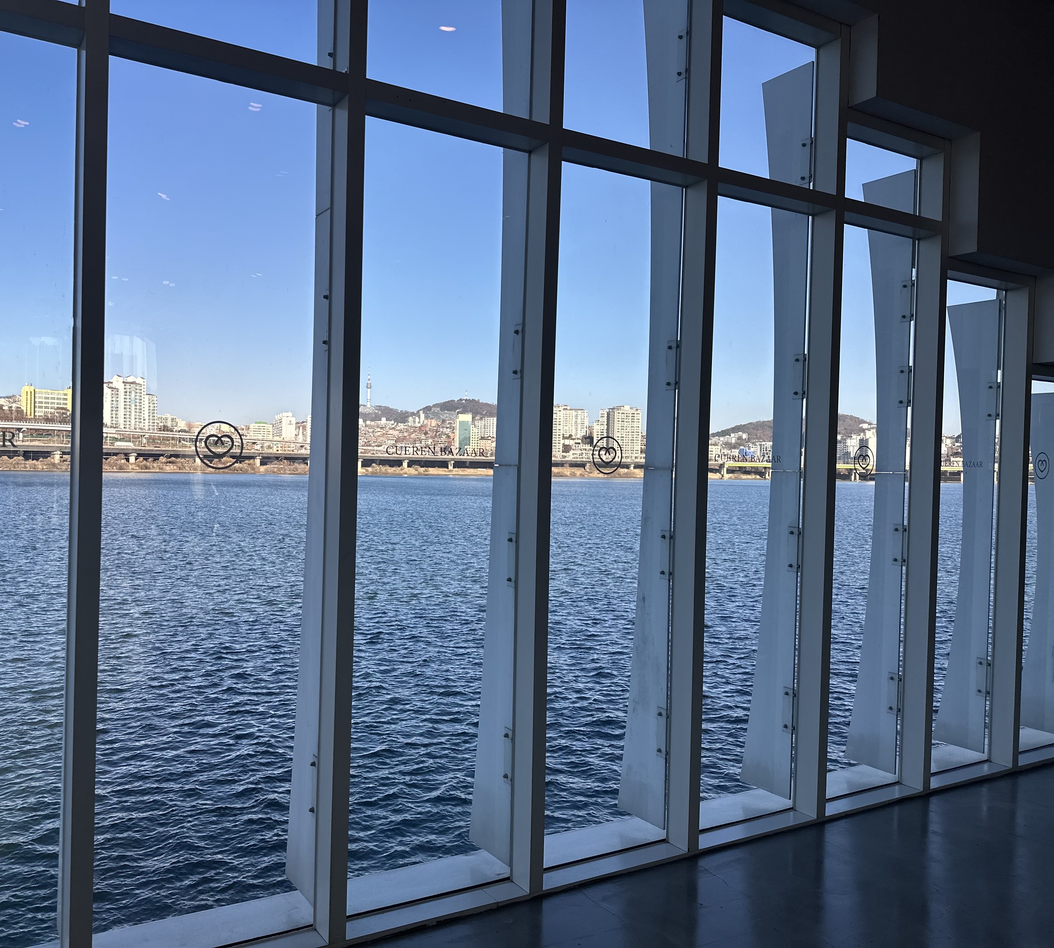 급히 걸어왔던 몸과 기다리느라 지쳤던 마음을 실내에서 강을 보며 힐링해봅니다